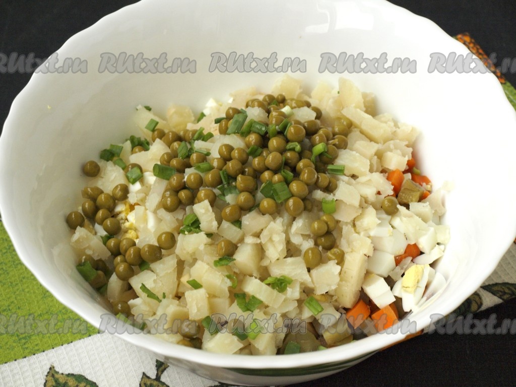 В салатник добавить горошек и немного зелёного лука, остальной зелёный лук оставить для подачи.