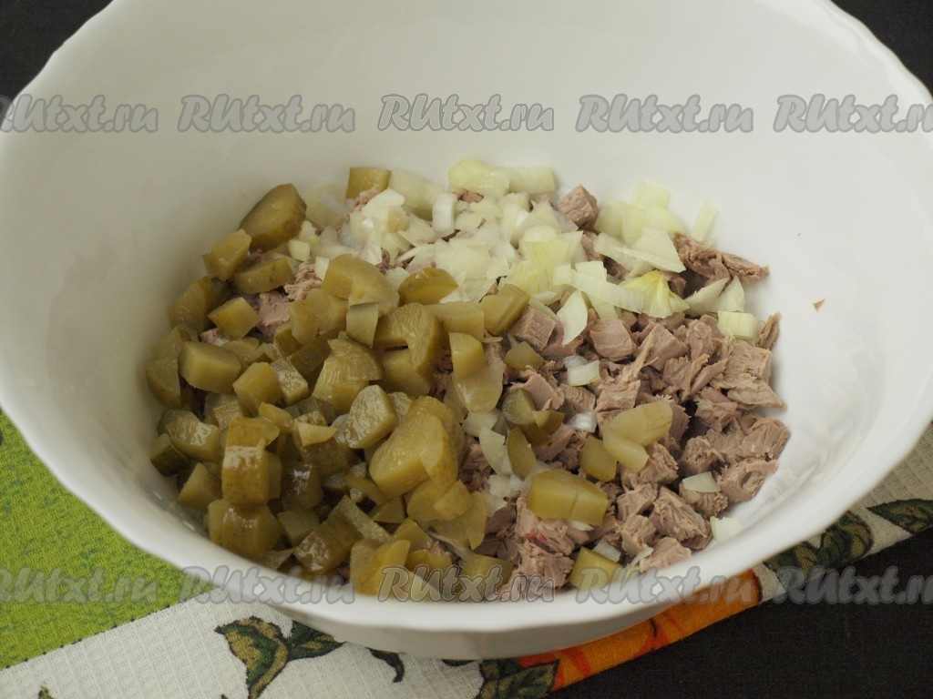 Нарезать кубиками отварную говядину, сложить в глубокую ёмкость. Нарезать огурцы и лук.