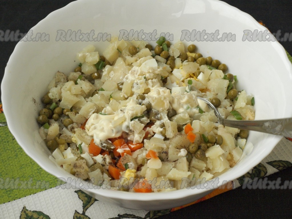 Салат посолить и поперчить, добавить майонез, лучше домашний, хорошо перемешать.