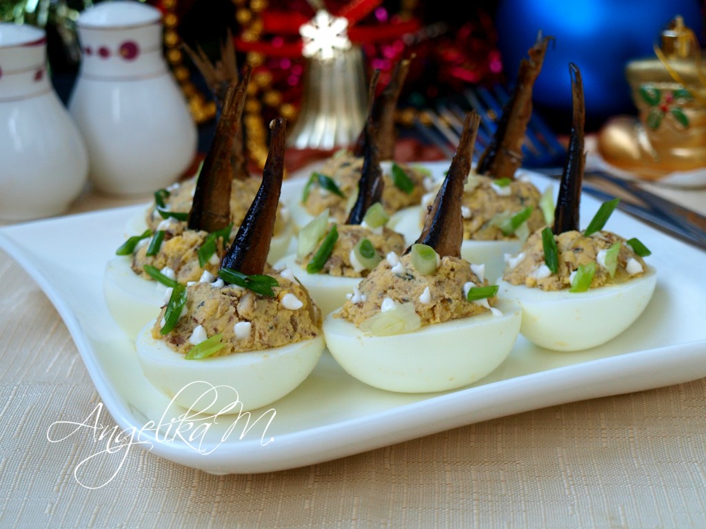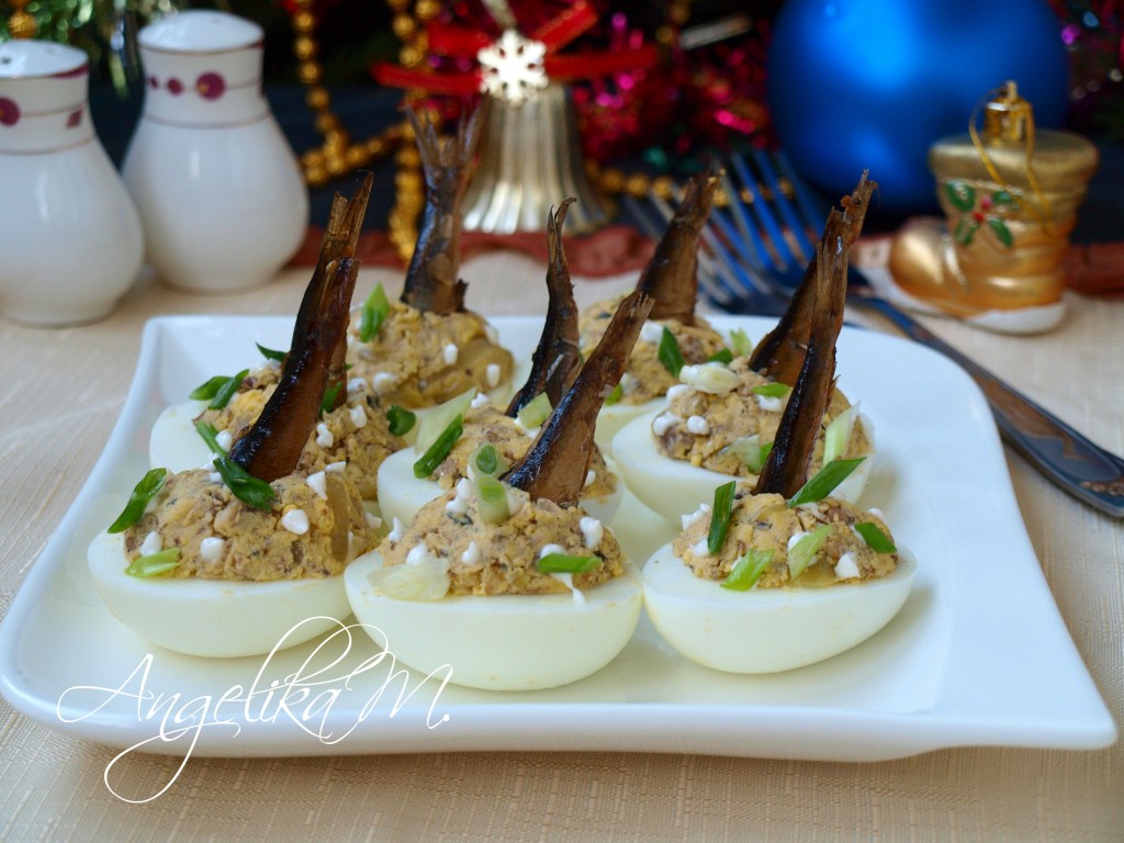 На праздничный стол хозяйки часто готовят фаршированные яйца. Такая закуска всегда актуальна и востребована, а вариантов может быть очень много. Я предлагаю приготовить яйца, фаршированные шпротами и желтками, а оформление сделать по аналогии с известным салатом "Рыбки в пруду". Эта простая и вкусная закуска смотрится на столе очень оригинально!