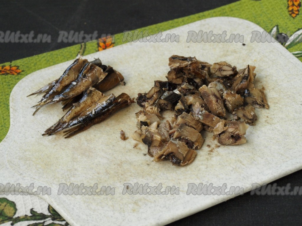У шпрот отрезать хвостовую часть длиной около 4 сантиметров (эта часть потребуется нам для украшения). Оставшуюся часть шпрот нарезать кусочками.