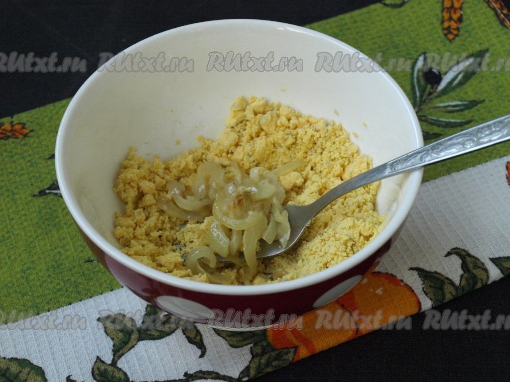 Вынуть желтки, переложить в глубокую тарелку, размять вилкой. Лук очистить, нарезать четверть кольцами, обжарить, периодически перемешивая, на подсолнечном масле до прозрачности, дать остыть. Добавить жареный лук к желткам.