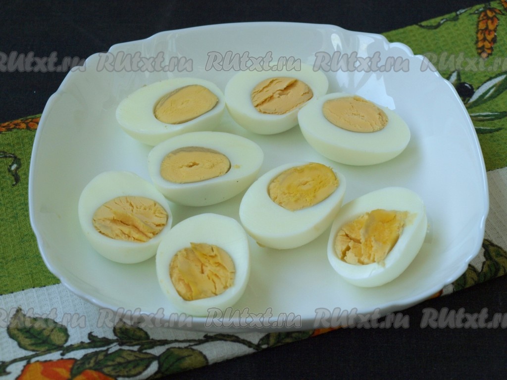 Яйца сварить вкрутую (в течение 10 минут с момента закипания воды), очистить и разрезать на 2 половинки.