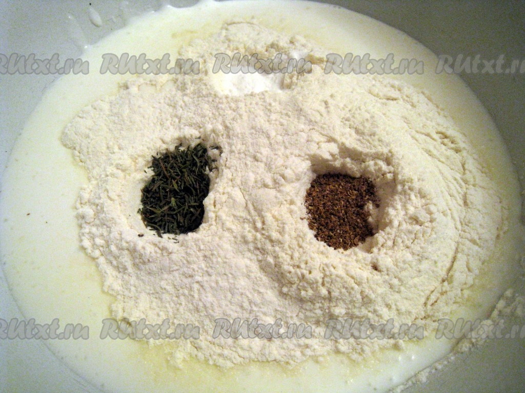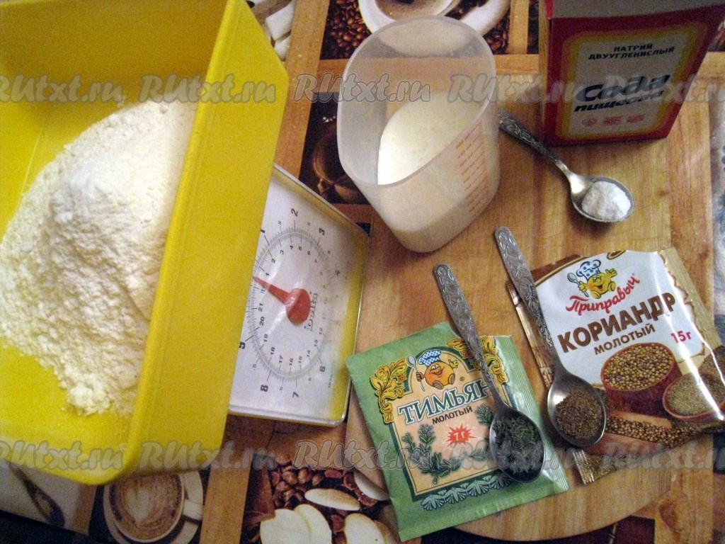 Соединить в миске кефир, муку, соду (не гасить), тимьян и кориандр.