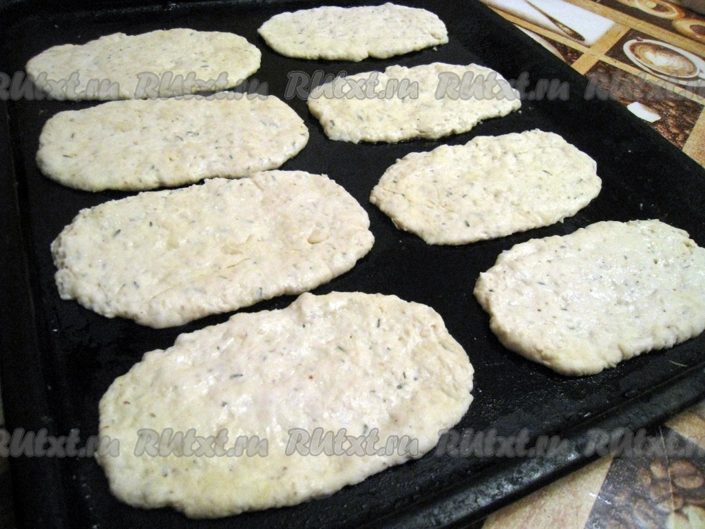 Раскатать каждый кусочек теста в овальную лепешку, положить на смазанный противень (или силиконовый коврик или бумагу для выпекания) и испечь в разогретой духовке при 200 градусах 5-7 минут.