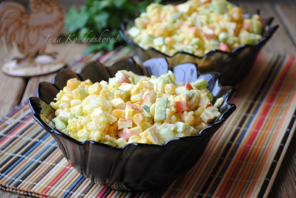 Кукурузу (без жидкости) выложить в салат к огурцам и яйцам.