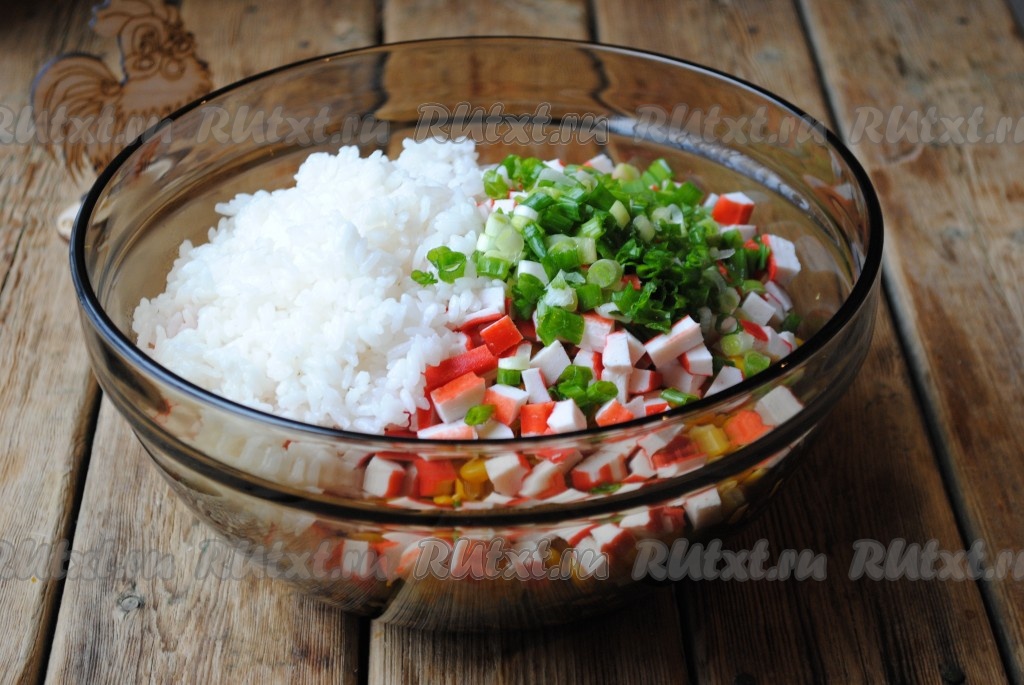 Мелко нарезанный зелёный лук и остывший рис выложить в крабовый салат.