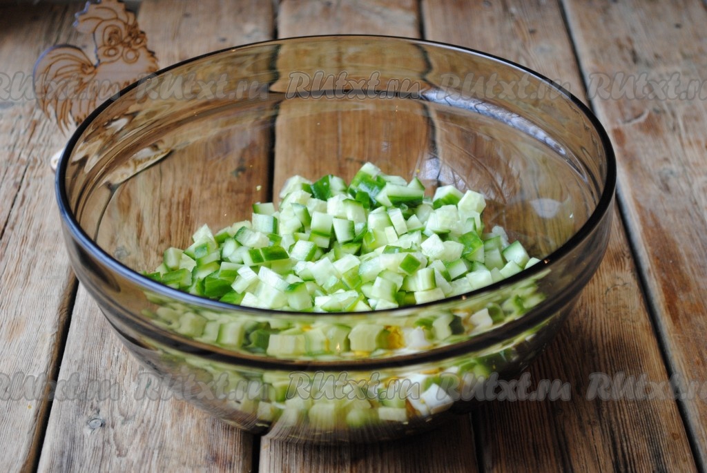 Огурчики нарезать такими же кубиками и выложить к яйцам.