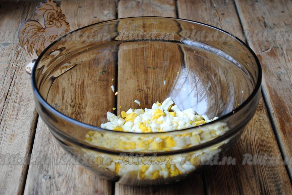 Этот салат будет особенно вкусным, если сваренный рис получится рассыпчатым. Я варю рис по этому рецепту, он получается рассыпчатым и прекрасно подходит для салатов. Яйца нарезать кубиками.
