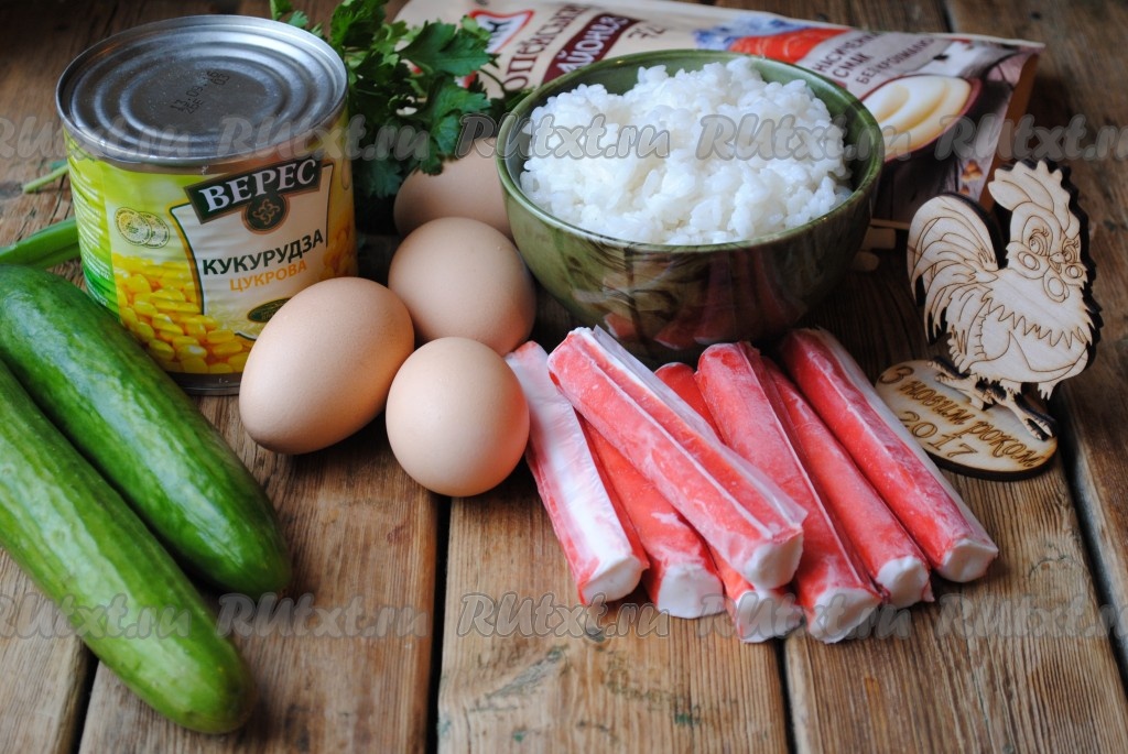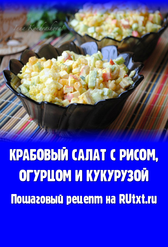 Крабовый салат с рисом, огурцом и кукурузой настолько полюбился нашей семье, что я часто готовлю его на праздники. Все компоненты в этом салатике прекрасно сочетаются между собой, в результате получается очень нежный вкус. Попробуйте!