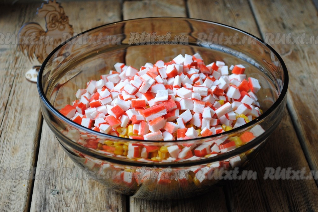 Крабовые палочки (если палочки замороженные, их надо разморозить) нарезать кубиками и добавить в салат.