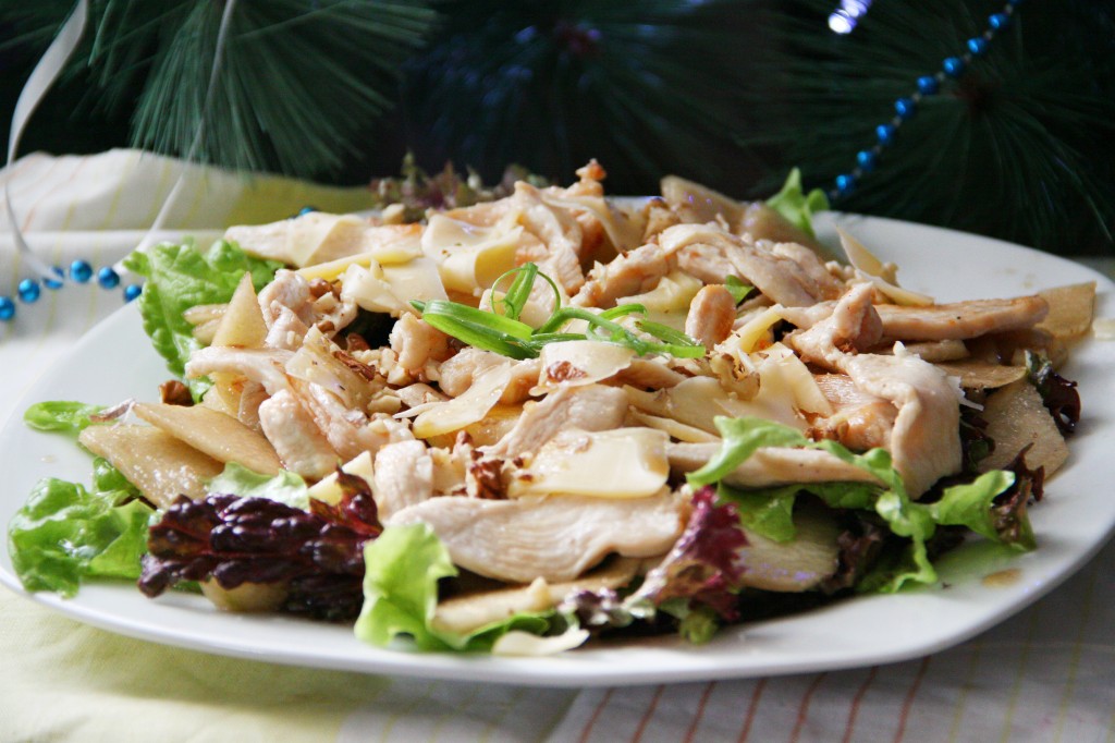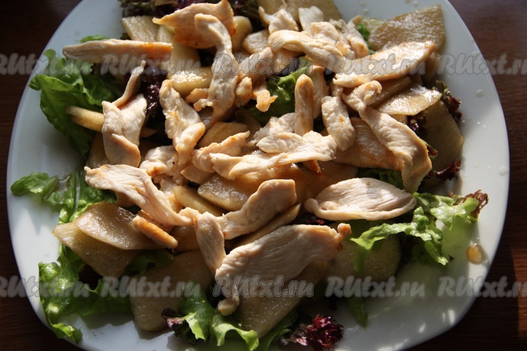 Присыпать все натёртым сыром, орешками, солью, перцем и полить соусом, в котором мариновались груши. Изумительно вкусный салат с грушей, сыром и курицей готов.