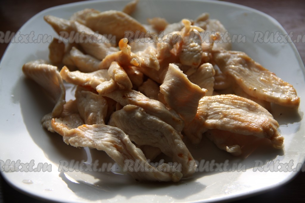 Если вы используете сырое куриное филе, то его нужно нарезать брусочками, посолить, поперчить и обжарить на сковороде с добавлением растительного масла с двух сторон до готовности. Если у вас копченое куриное филе, нарежьте его брусочками.
