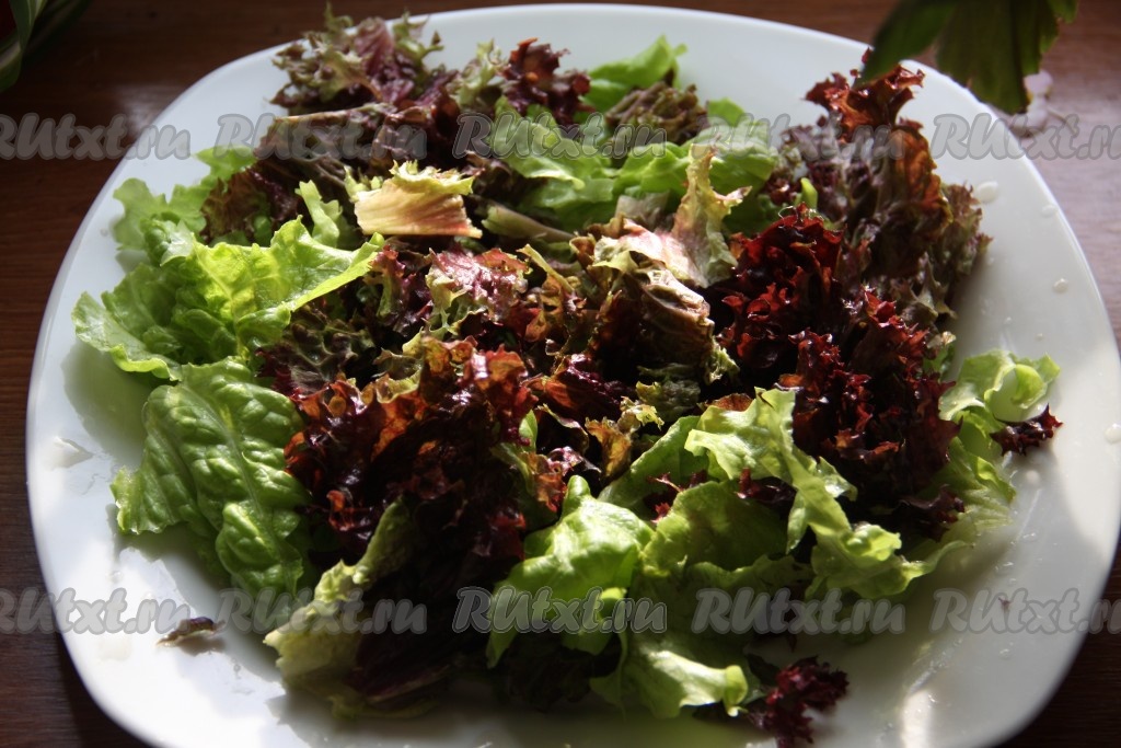 Листья салата вымойте, нарвите кусочками и выложите на блюдо.