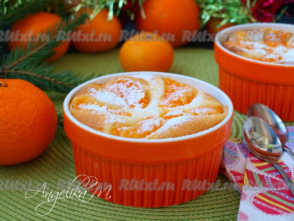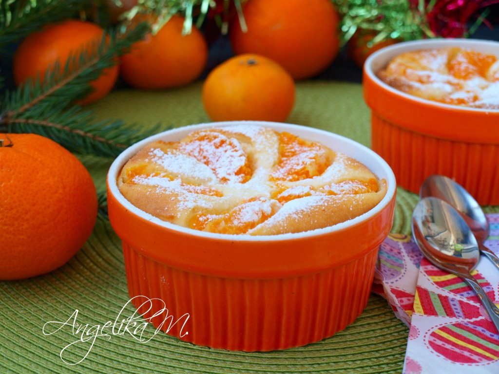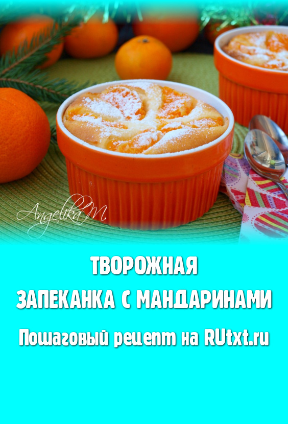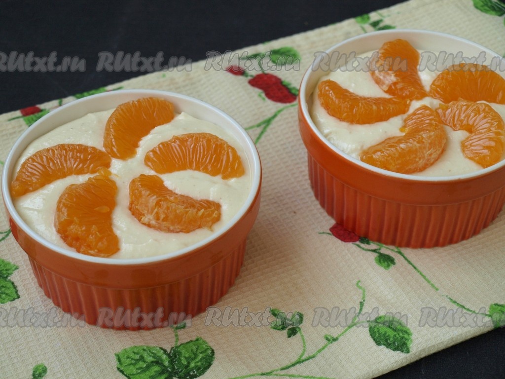 Дно и бока большой формы (или 2 порционных формочек) смазать сливочным маслом. Выложить половину творожной массы в форму (или формочки). Мандарины очистить и разобрать на дольки. Каждую дольку освободить от плёночек и удалить, если есть, косточки. Разложить половину долек мандаринов поверх творожной массы, слегка утапливая фрукты.