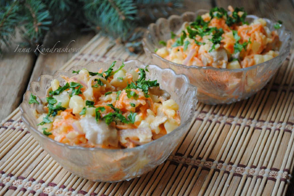 Для приготовления салата с маринованными грибами и корейской морковкой потребуется: