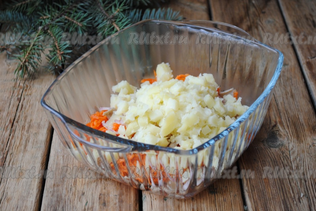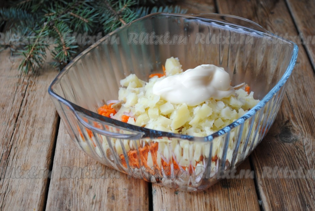 Картофель отварить в мундире, остудить, очистить и нарезать кубиками, добавить в салат.