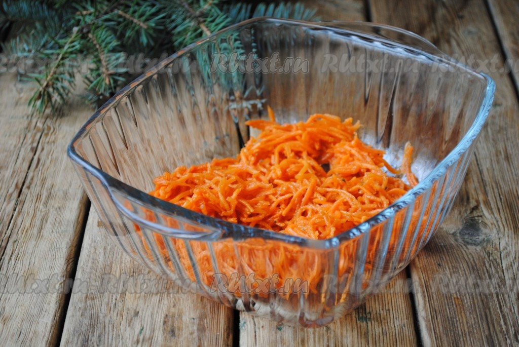 Морковь по-корейски отжать от сока и, если она натёрта очень длинной соломкой, нарезать её и выложить в салатницу.