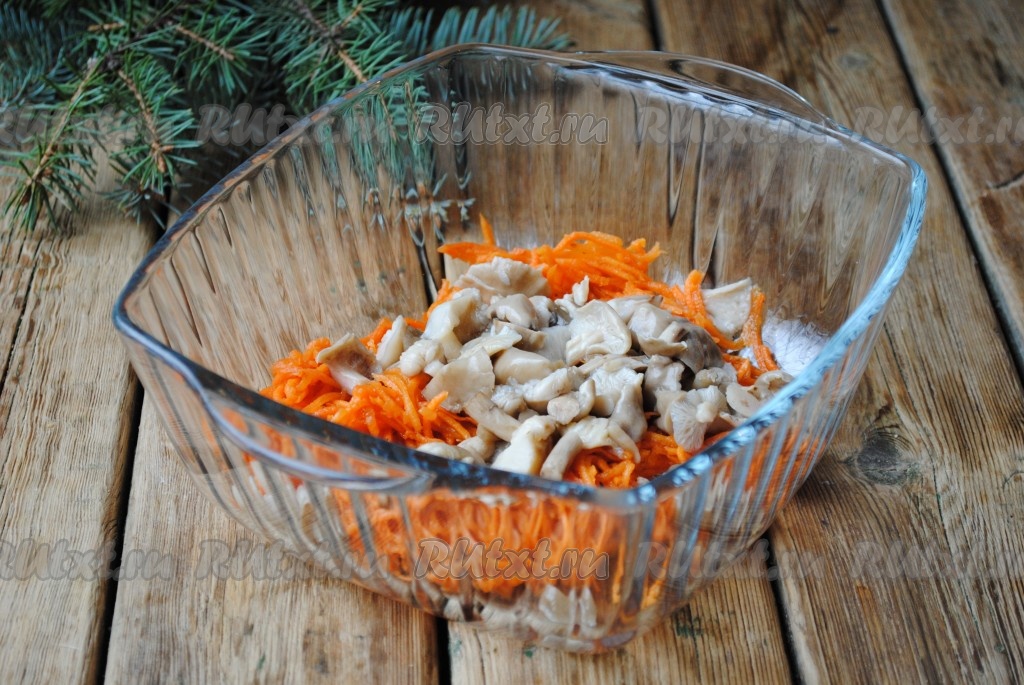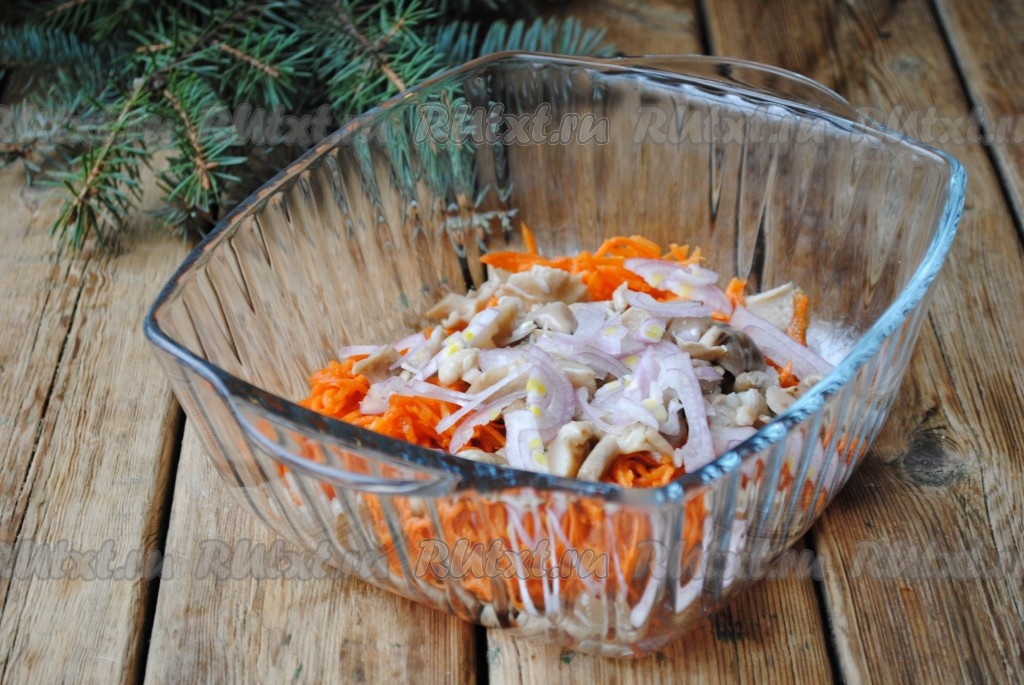 Очищенный лук нарезать тоненькими полукольцами выложить к грибам и морковке. Если у Вас очень горький лук, то его предварительно обдать кипятком, чтобы ушла горечь, а затем добавить в салат.