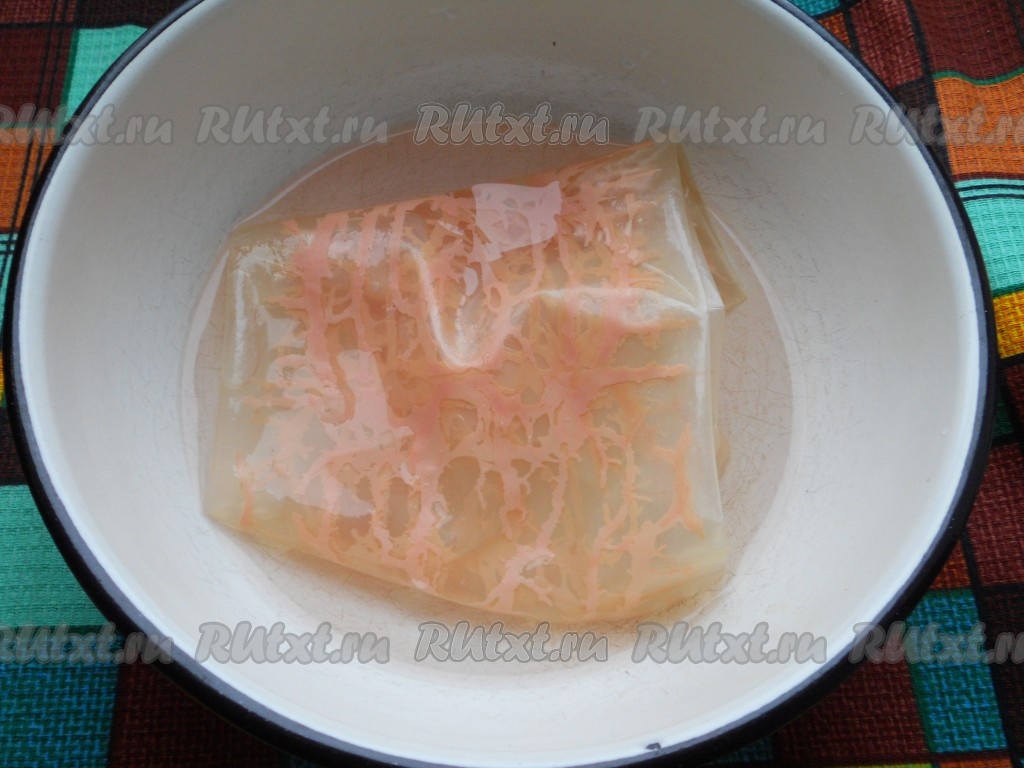 Коллагеновую оболочку для ветчин замочить в теплой воде на 10 минут.