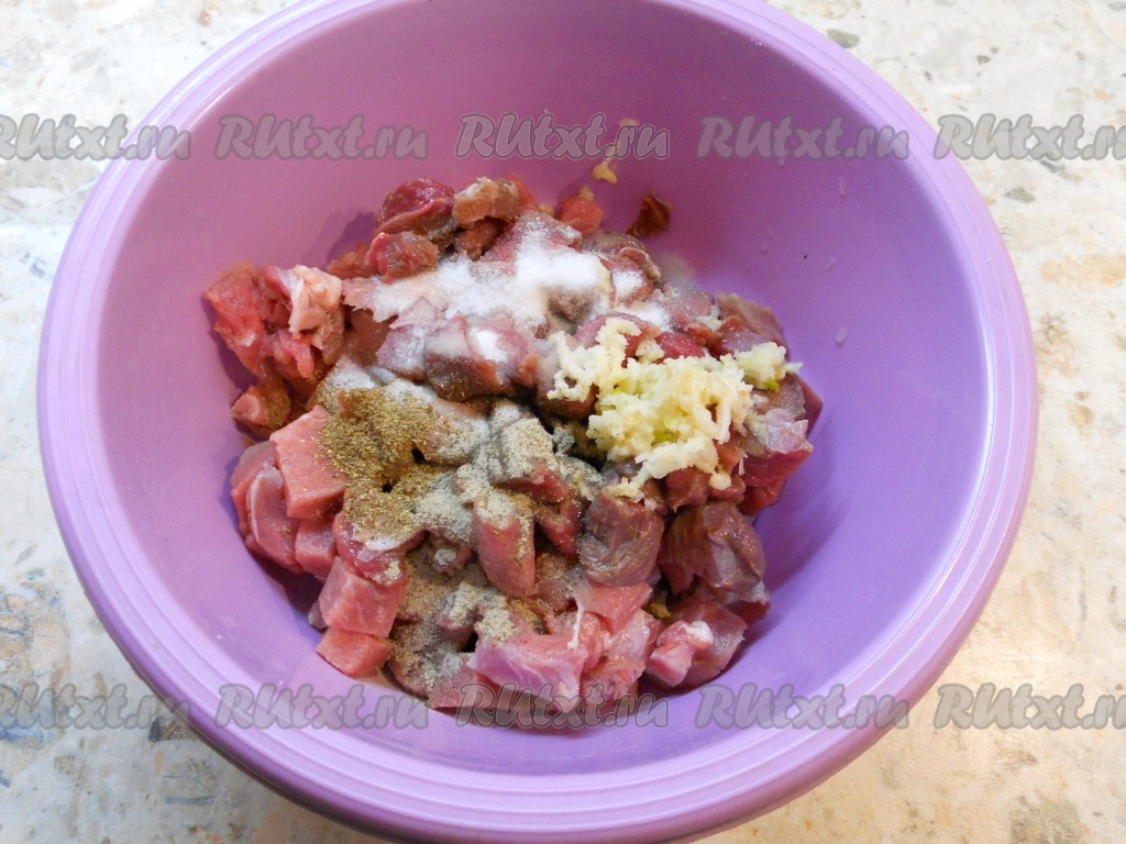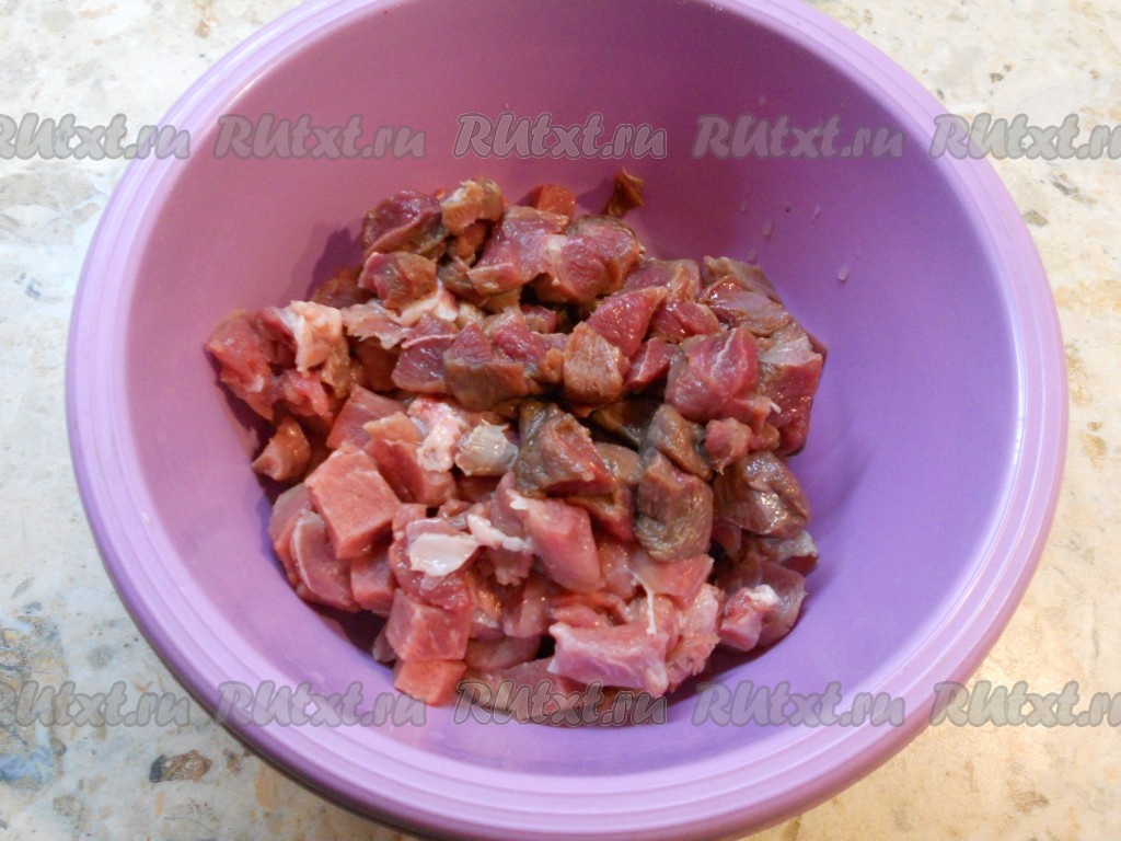 Все мясо подморозить, а затем нарезать квадратиками шириной 3-4 см.