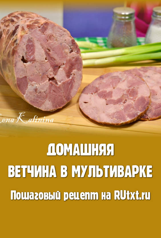 Поместить ветчину в чашу мультиварки, залить полностью холодной водой, выставить режим "Мультиповар" на 80 градусов на 3 часа, закрыть крышку мультиварки. Можно варить домашнюю ветчину и в кастрюле, полностью залив холодной водой, готовить также, как и в мультиварке, не давая воде кипеть (если есть специальный градусник, измерьте температуру (она должна быть 80 градусов)). Если нет в наличии коллагеновой оболочки, можно использовать пергамент, сложенный вдвое, или рукав для запекания, в обоих случаях нужно очень плотно перевязать концы и готовить ветчину не в воде, а на пару часа 4, выставив режим мультиварки "На пару".