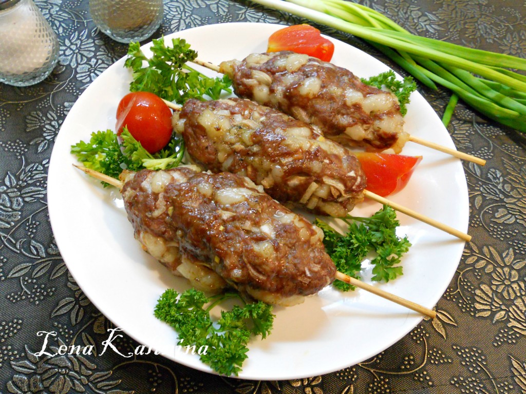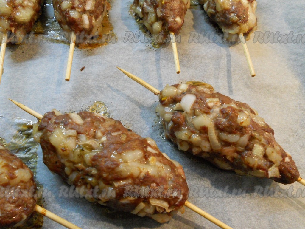 Тщательно все перемешать. Вымешивать и отбивать фарш в течение 10 минут, пока он не станет вязким. Поместить фарш в холодильник на 30-40 минут. Деревянные шпажки замочить в холодной воде на 10 минут. Сформировать продолговатые котлеты, вставить шпажки, поплотнее прижимая мясо. Поместить люля-кебаб на противень, застеленный пергаментом.