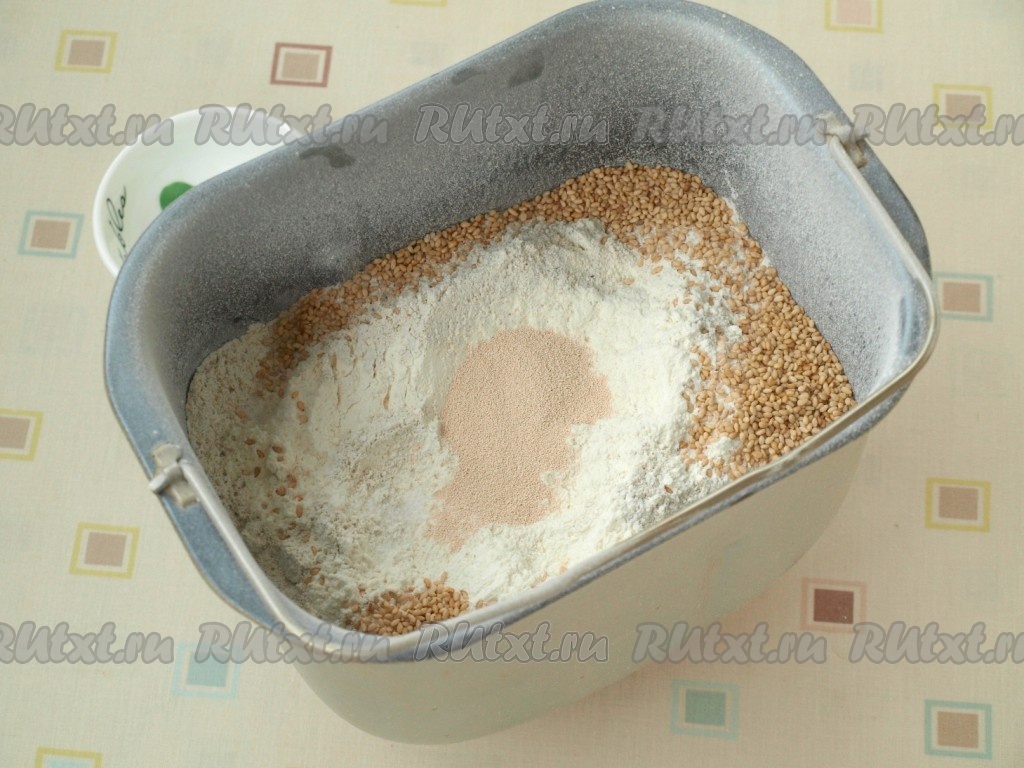 Насыпаем просеянную ржаную и пшеничную муку, по углам раскладываем кунжут и соль. В центре делаем углубление и всыпаем туда сухие дрожжи.