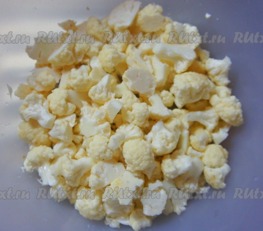 Цветную капусту вымыть, разделить на соцветия, крупные соцветия разрезать вдоль.