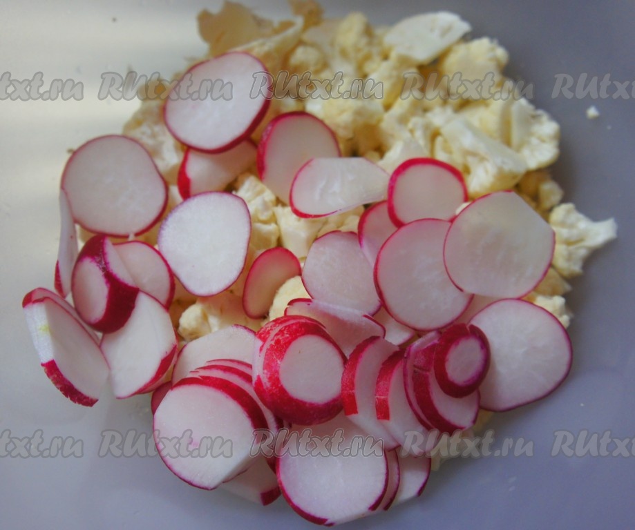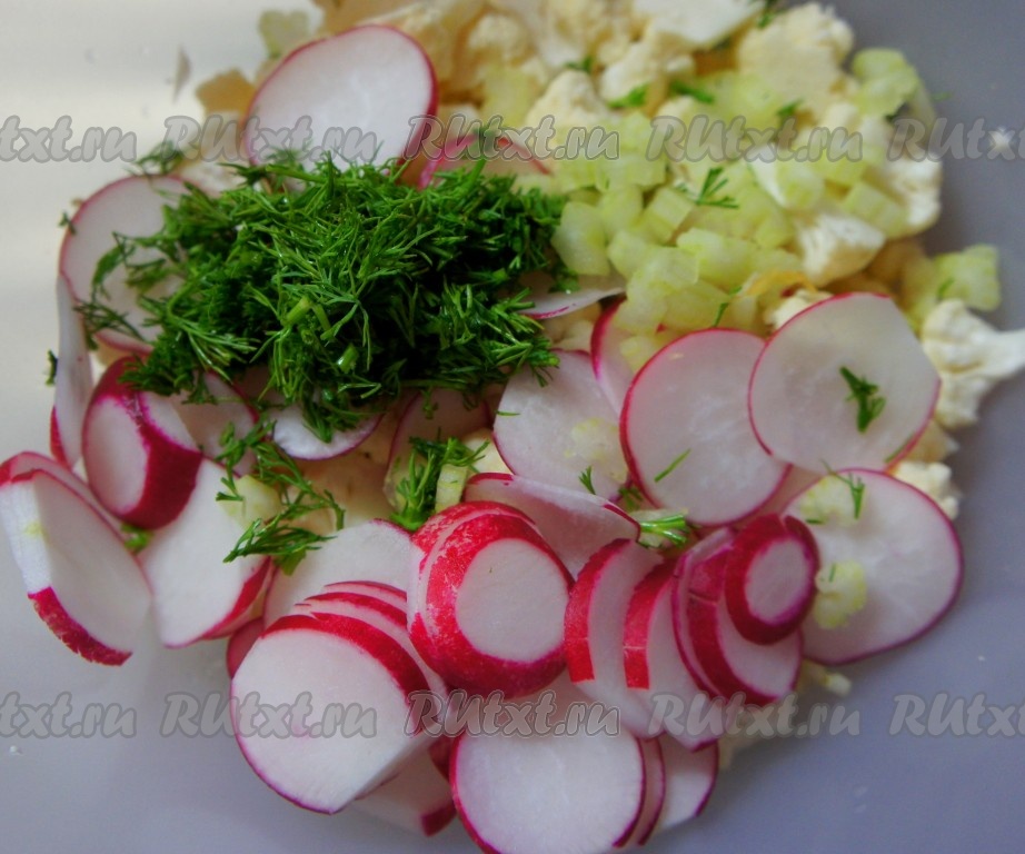Редиску нарезать тонкими "кружочками" и добавить в салат к свежей цветной капусте.