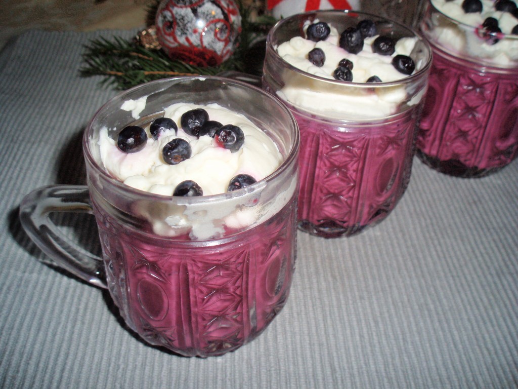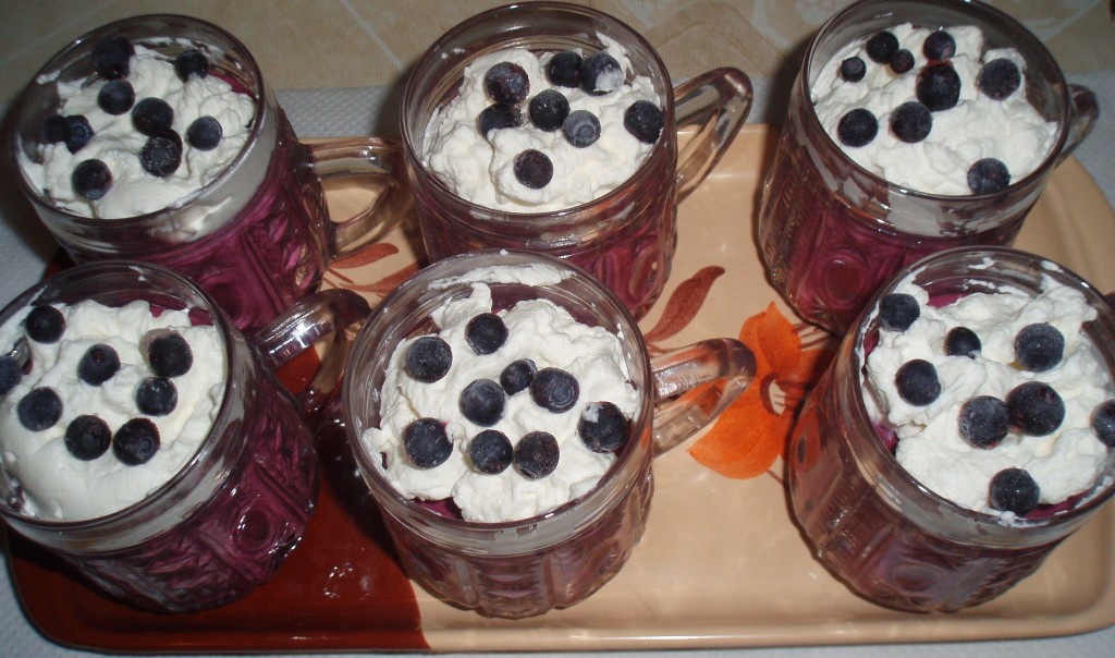 Перед подачей украсить десерт сливками, взбитыми с сахаром, и ягодами черники. Нежнейшая, с бархатистой консистенцией черничная панна-котта готова.