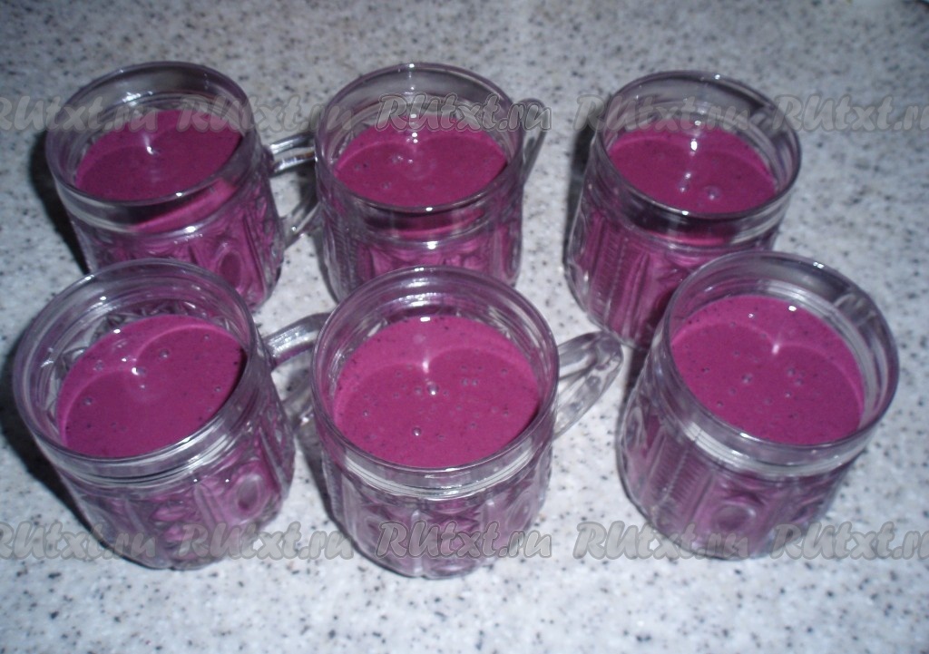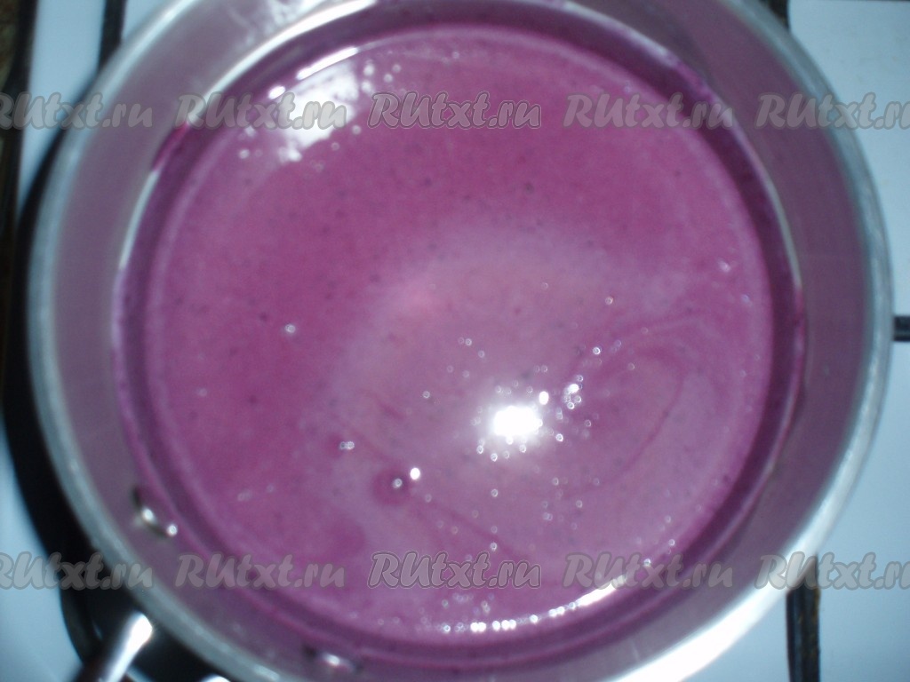 В горячую смесь молока и сливок добавить черничное пюре и желатин. Тщательно перемешать и остудить, несколько раз перемешивая.