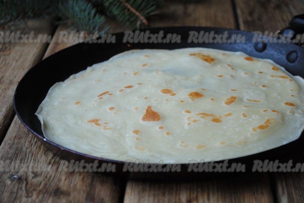 Сковороду хорошо разогреть, перед выпеканием первого блина смазать её растительным маслом, налить небольшое количество теста и равномерно распределить его по поверхности сковороды.