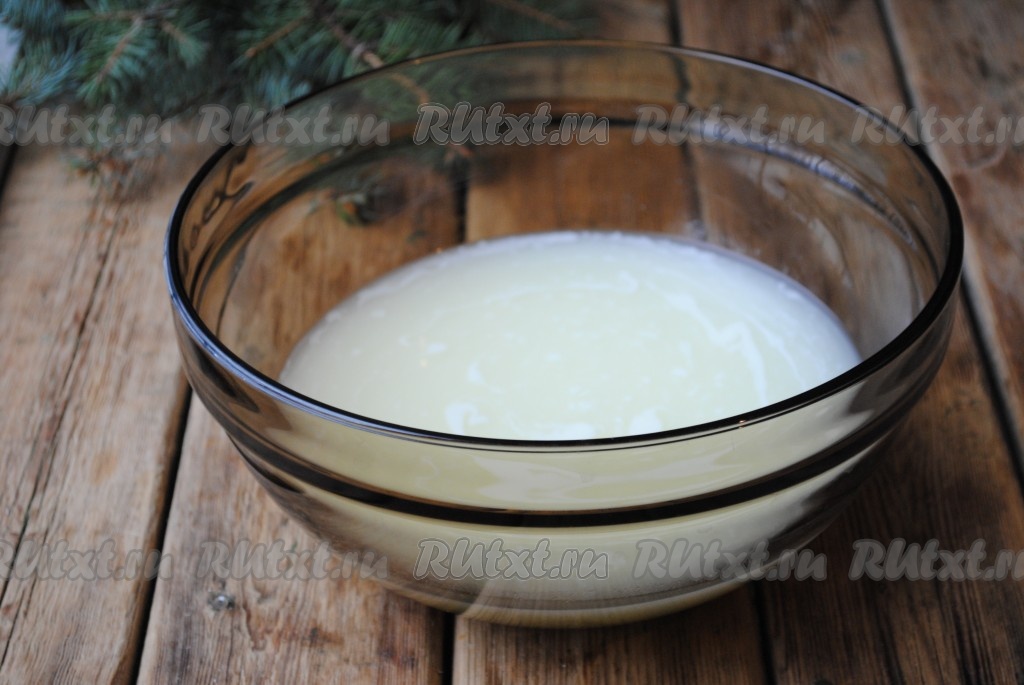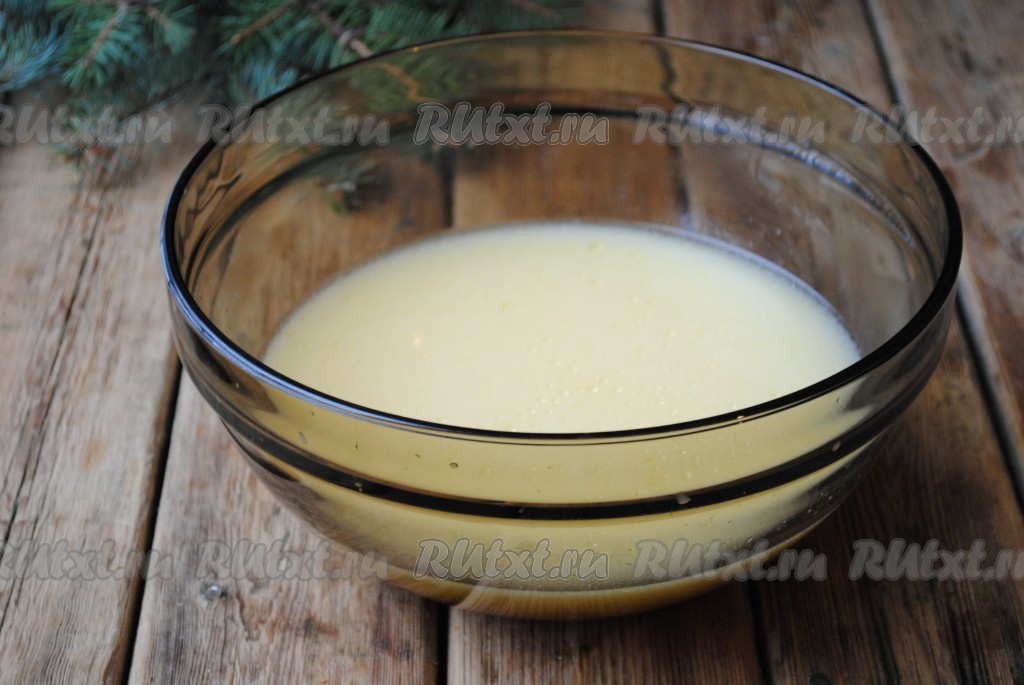 В сыворотку добавить яйца, сахар и соль, получившуюся массу хорошо перемешать венчиком (или с помощью миксера).