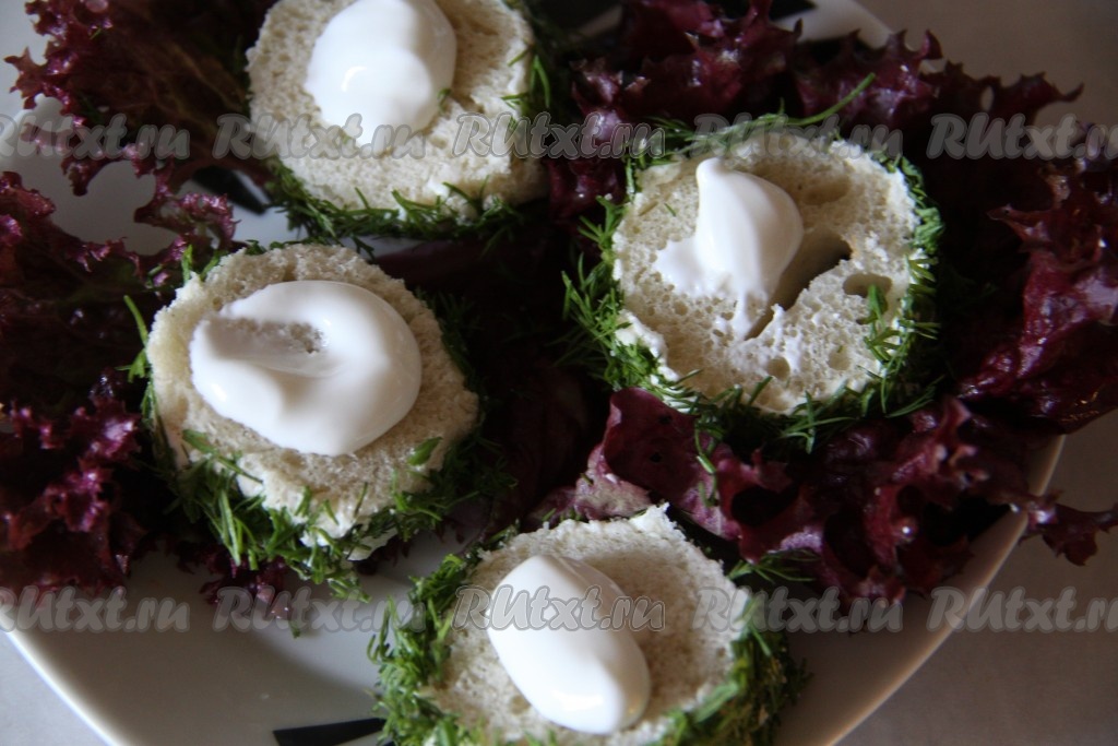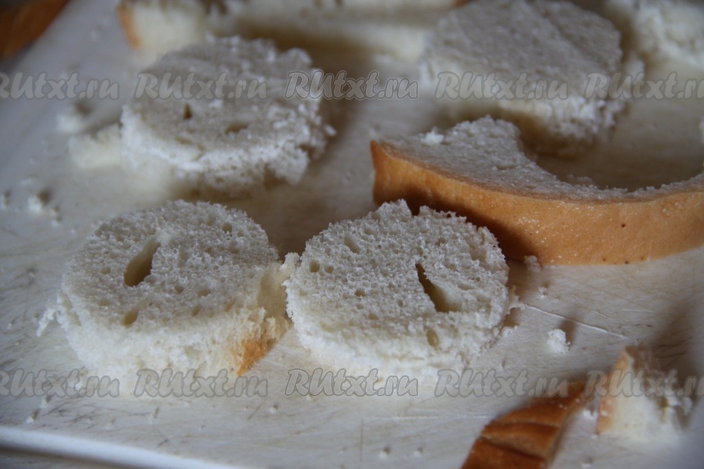 Батон нарезаем тонкими ломтиками и с помощью рюмки выдавливаем кружочки.