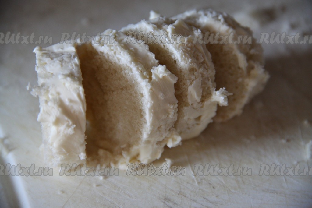 Сливки взбиваем и смазываем одну сторону хлеба.