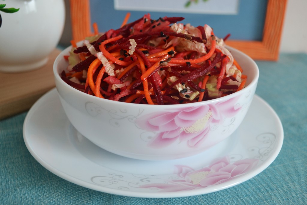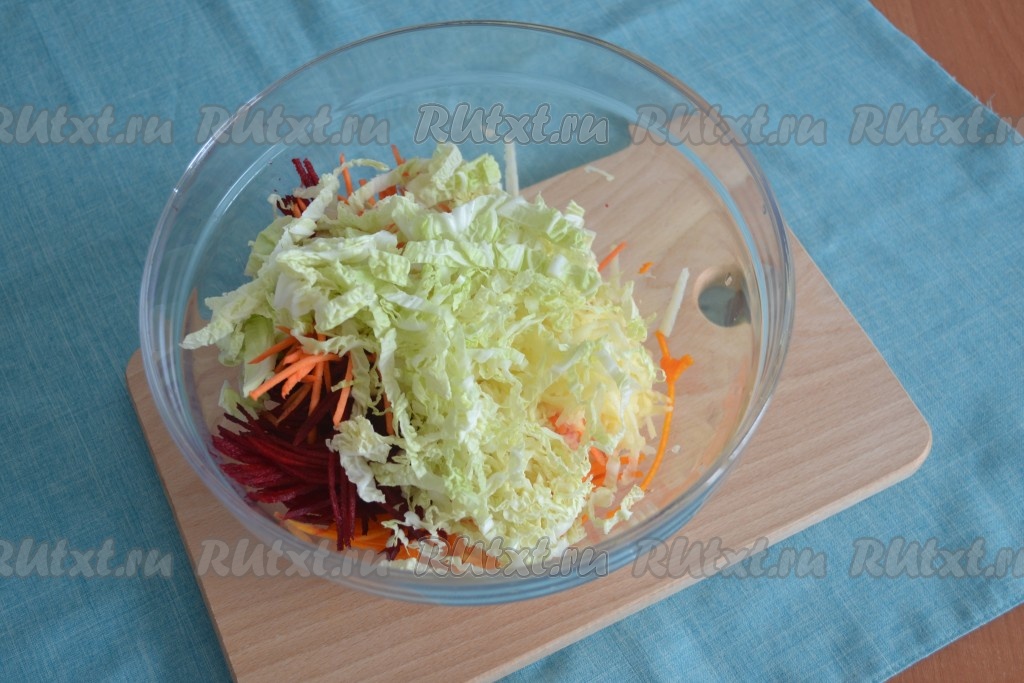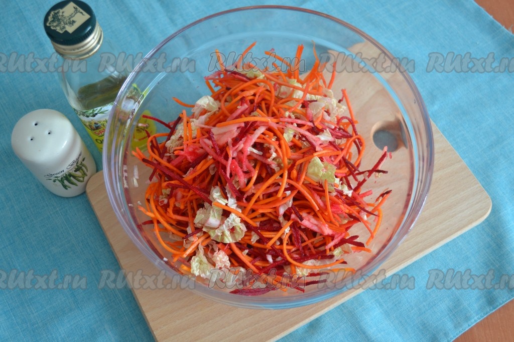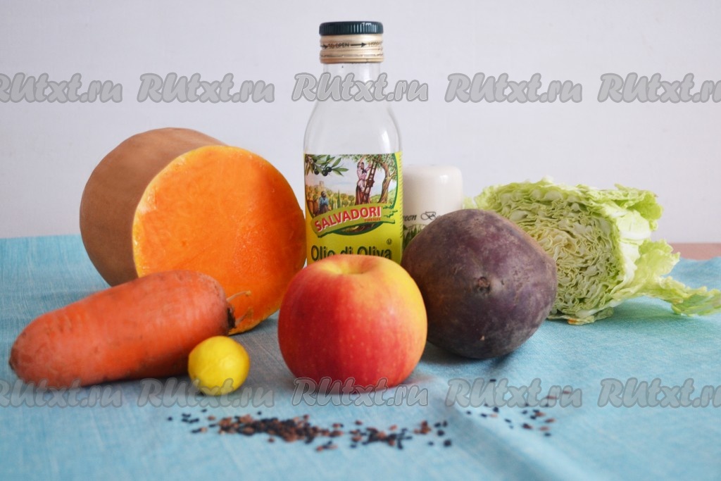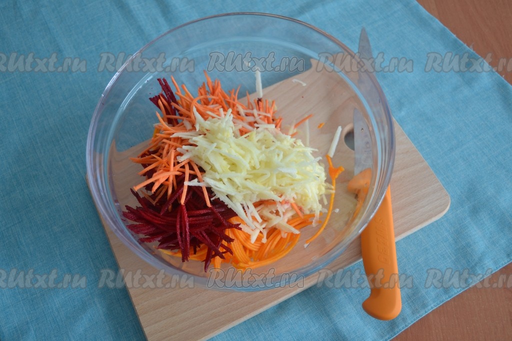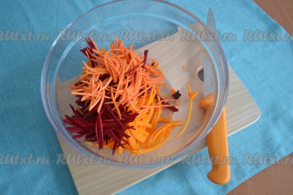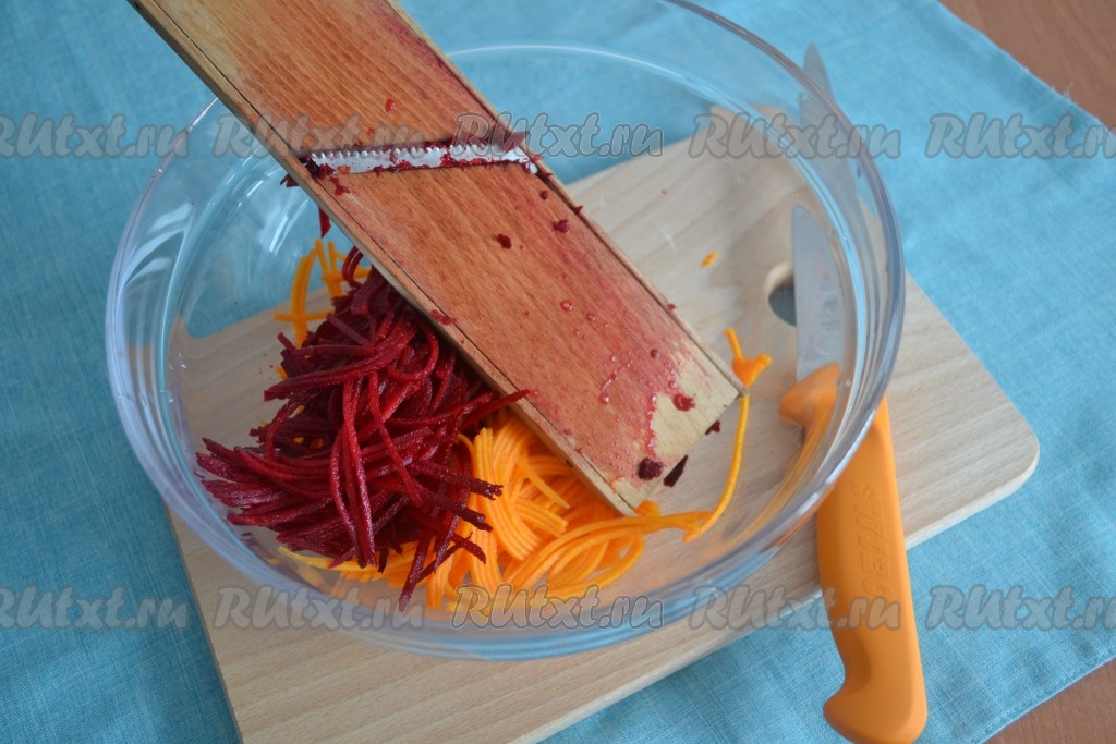 Точно также натереть очищенную сырую свеклу и добавить в салат к тыкве.