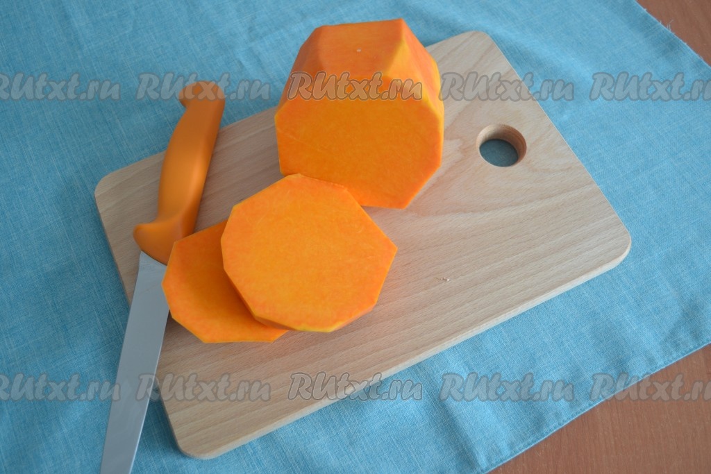 Очистить тыкву от кожицы. Плотную мякоть без косточек разрезать на несколько частей.