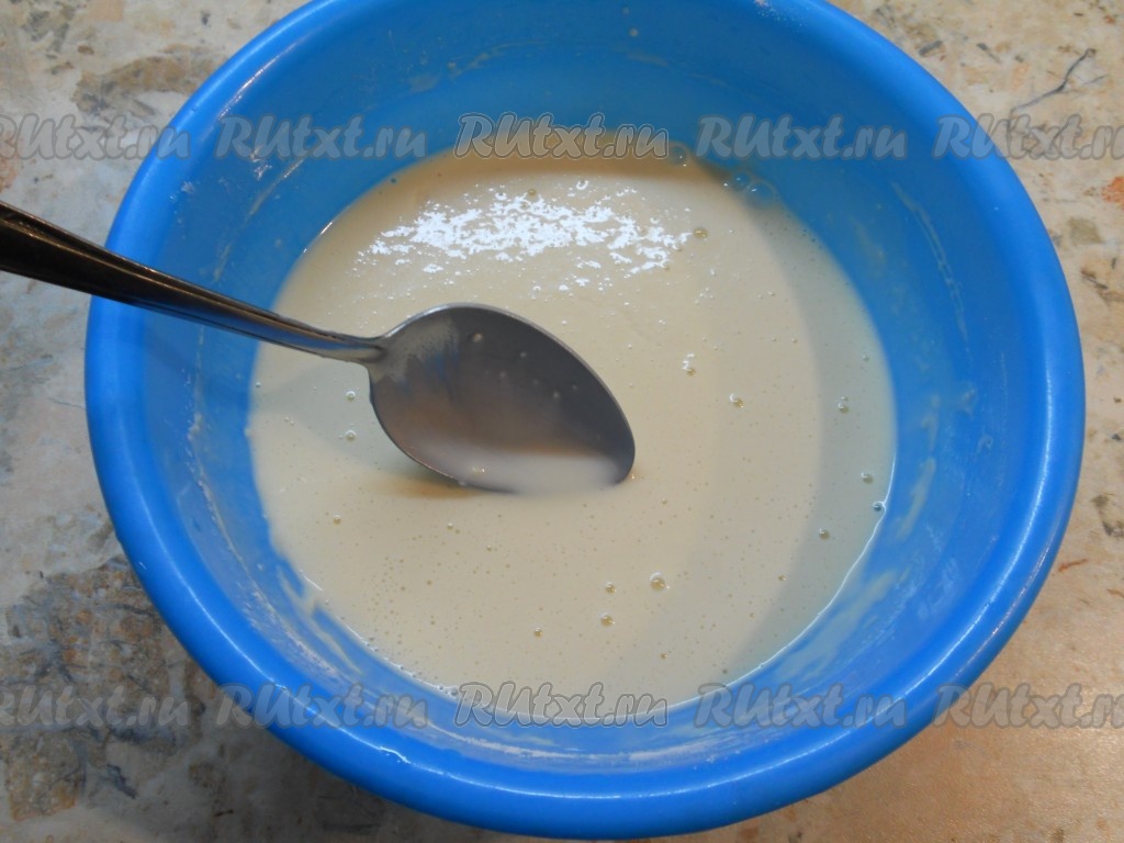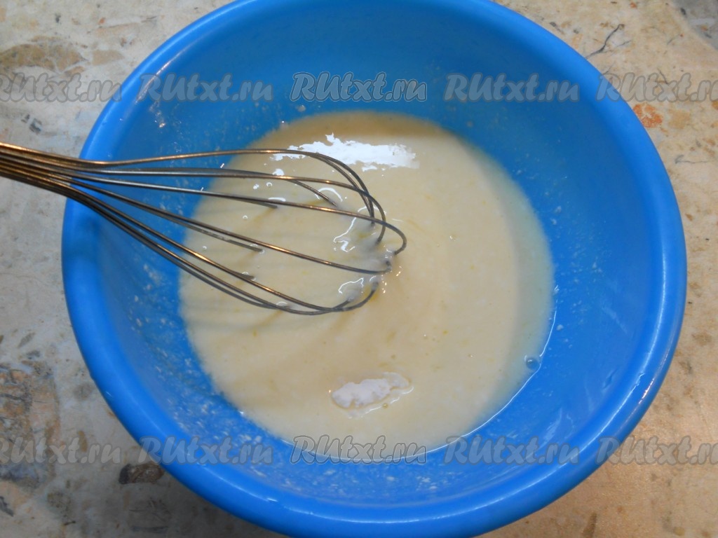 Влить кефир или кислое молоко, добавить соду и хорошенько взбить все венчиком.