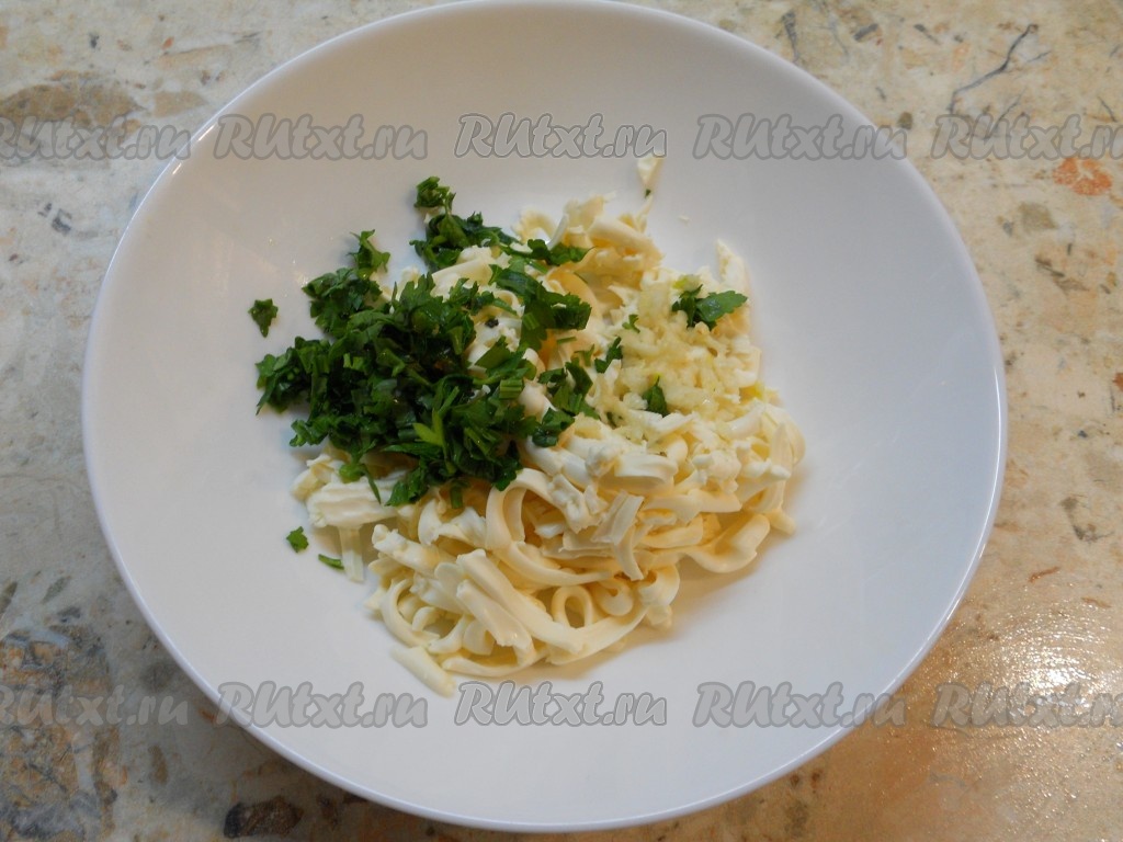 Приготовить начинку: плавленный сырок натереть на крупной терке, добавить пропущенный через пресс чеснок и измельченную петрушку.