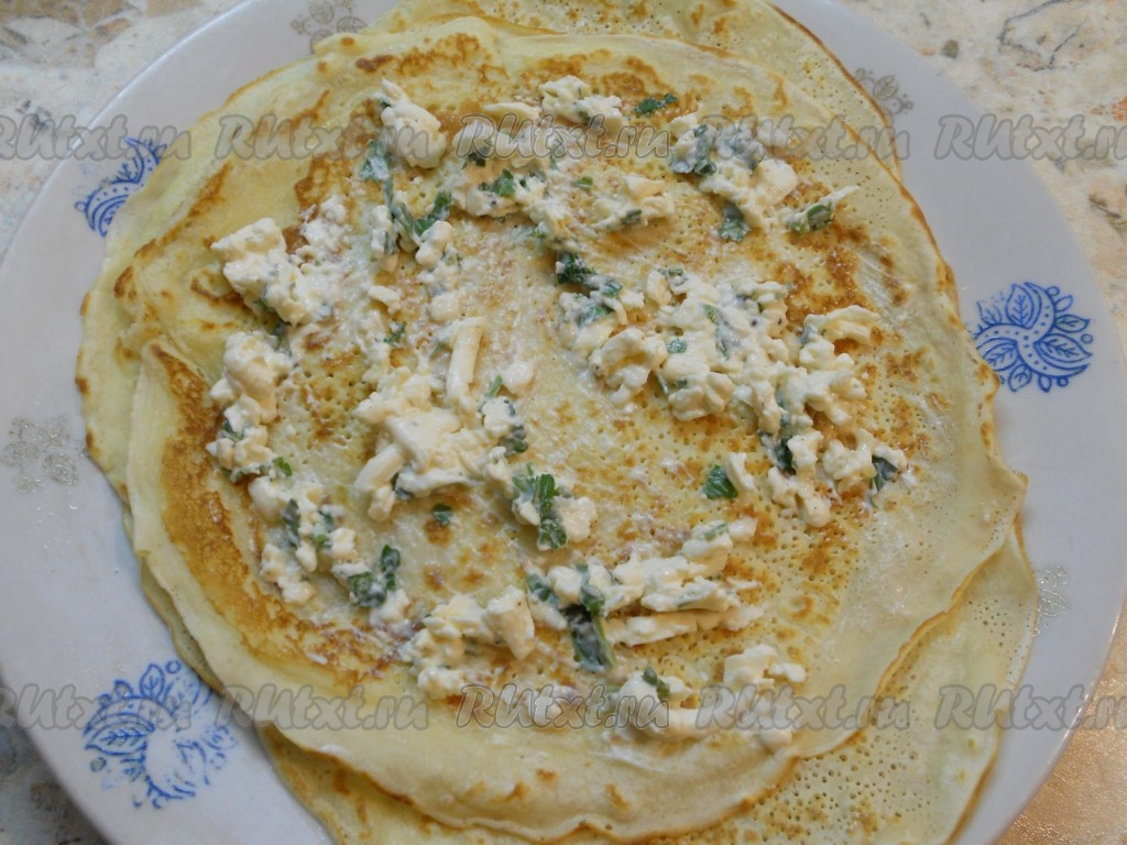 Далее теплые блинчики смазать начинкой из плавленного сыра и чеснока (не слишком густо).