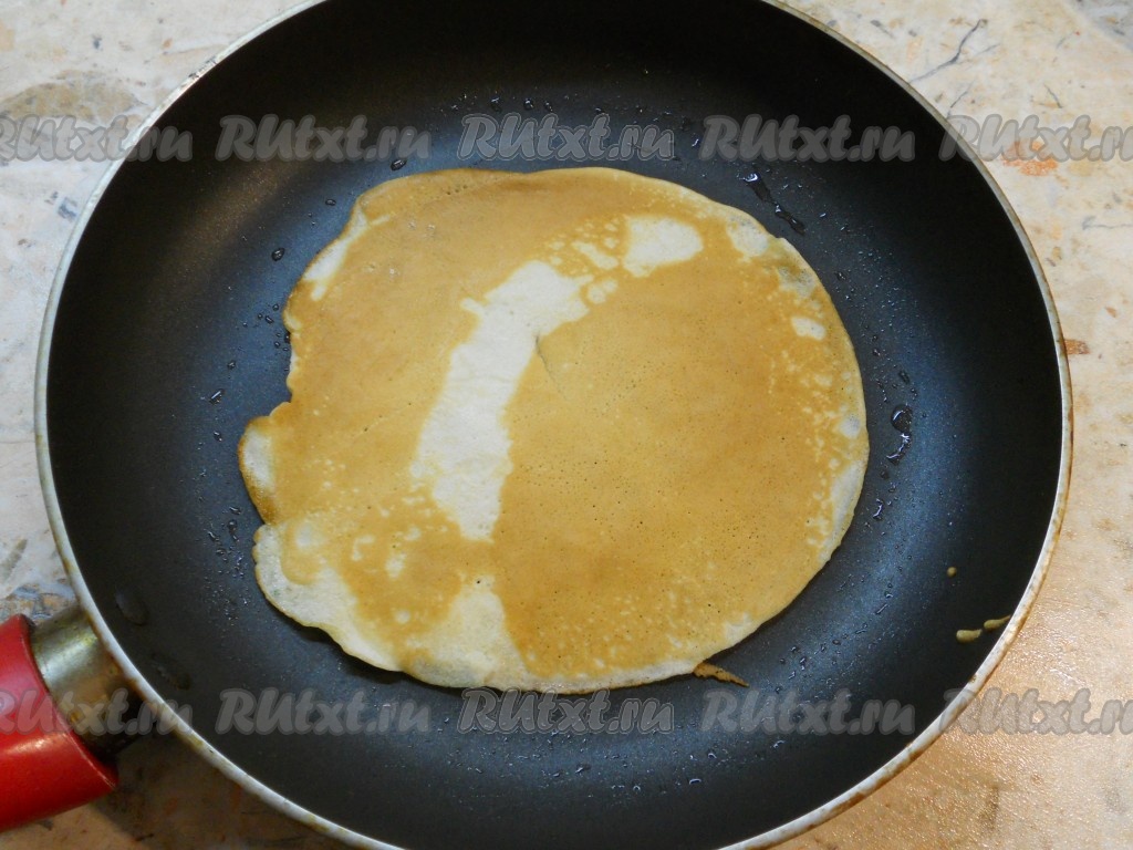 Блинчики пожарить обычным способом - до румяности с двух сторон на среднем огне, смазывая сковороду растительным маслом.