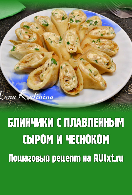 Блинчики с плавленным сыром и чесноком - отличная закуска, которая украсит любой праздничный стол. Готовятся такие блины просто, а получаются очень вкусными и интересными. По желанию, в начинку для блинов можно добавить жареные грибочки, вареные яйца, колбасу и т.д. Попробуйте!