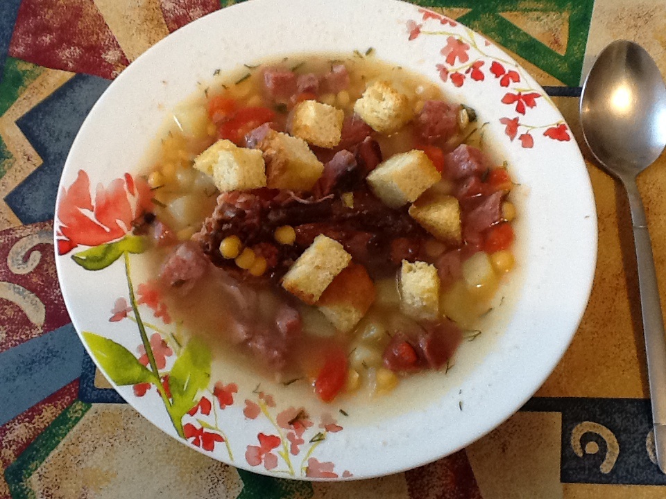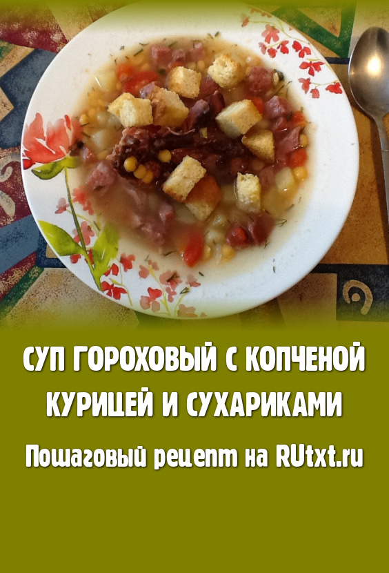 Наш гороховый суп с копченой курицей и сухариками готов! Подаем к столу и угощаем наших близких!