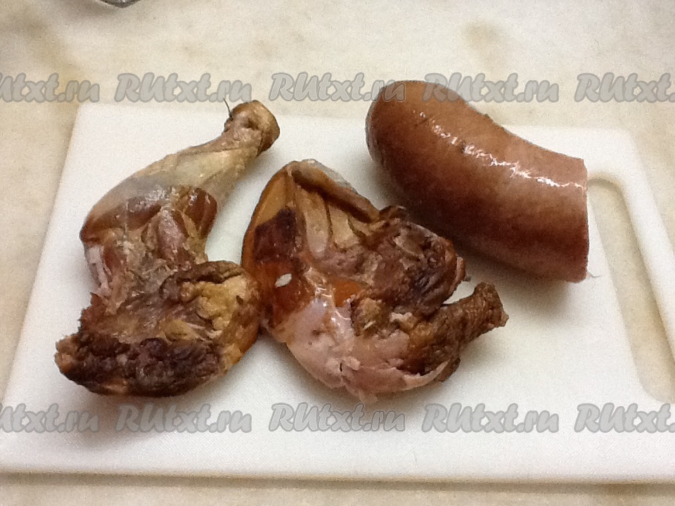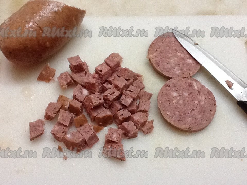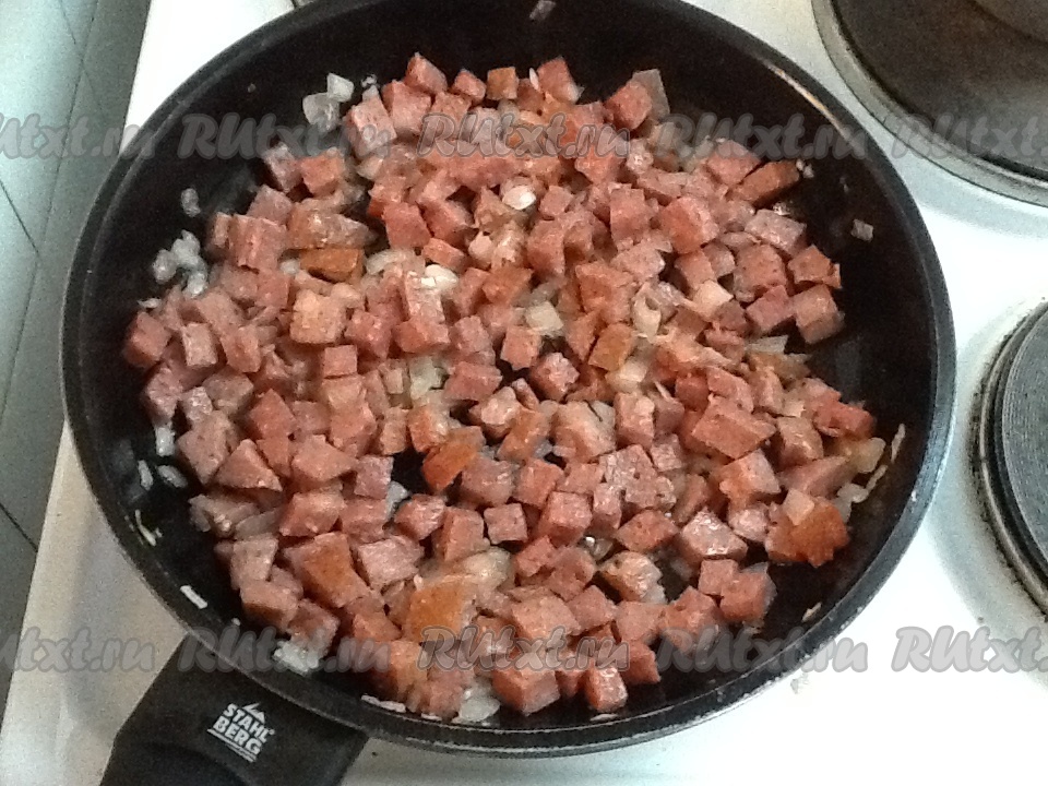 Копченую колбасу нарезать и добавить на сковородку к луку.