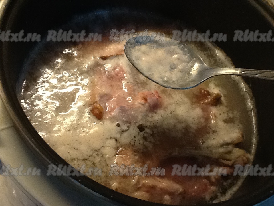 Залить горох водой, добавить кусочки копченой курицы и поставить вариться в мультиварке на режиме "Суп" на 50 минут.