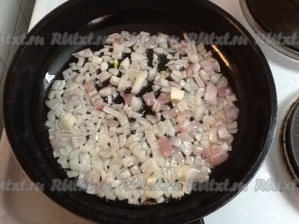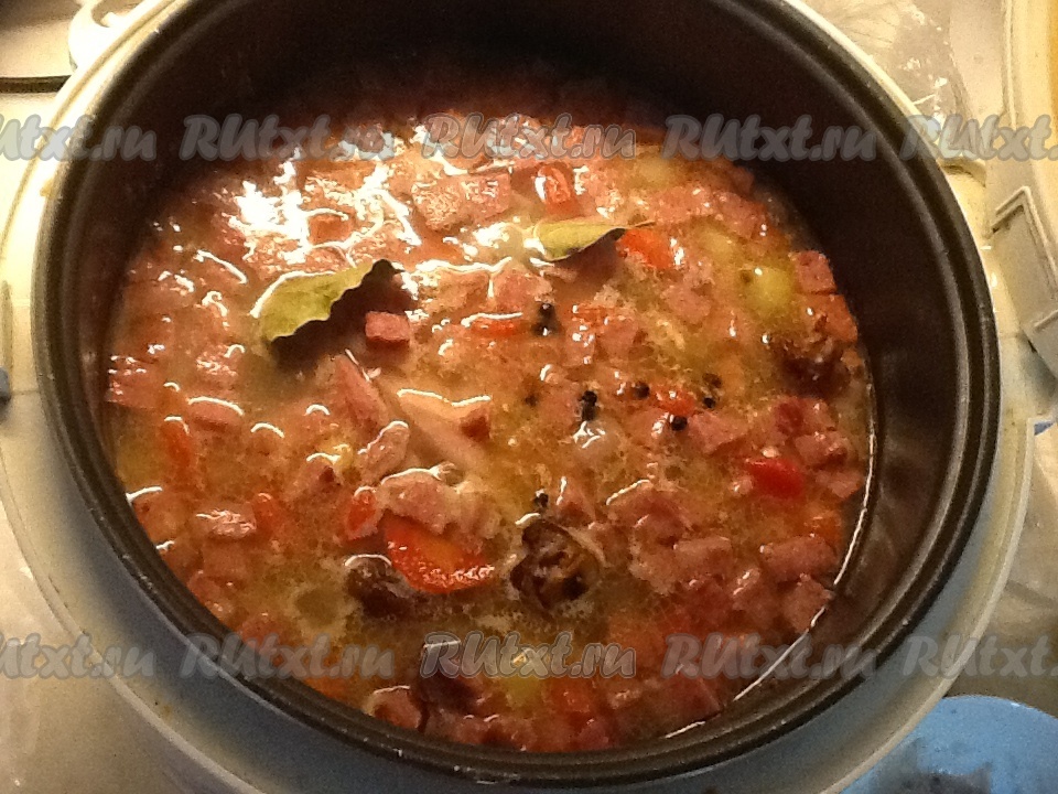 Обжарить лук с колбасой и выложить в мультиварку. Оставить вариться с закрытой крышкой 15 минут.