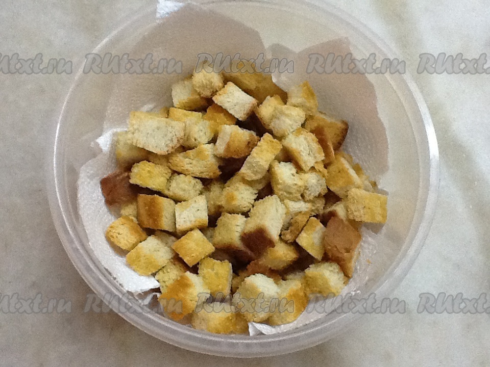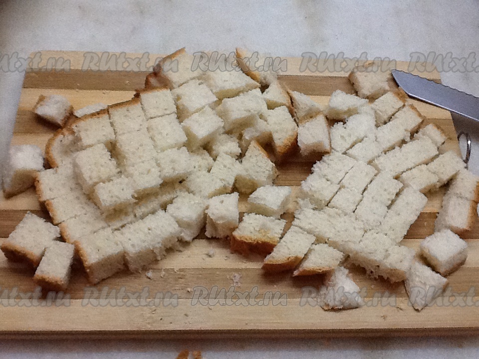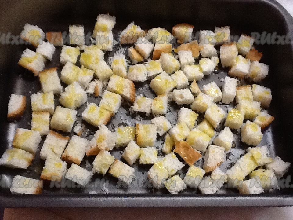 А тем временем займемся подготовкой сухариков. Включить духовку на 200 градусов. Нарезать белый хлеб на кубики, выложить на противень, сбрызнуть оливковым маслом и посыпать специями. Можно немного посыпать чесночком и посолить.