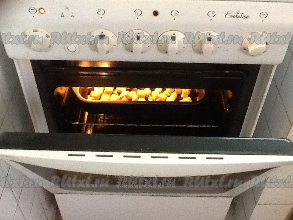 Поставить противень с будущими сухариками в разогретую духовку на 15 минут. Дверцу не закрывать - чтобы выходила влага.