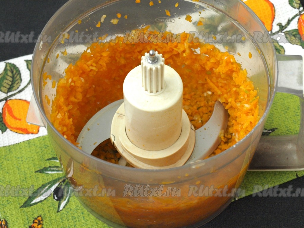 Вес тыквы указан в очищенном виде. Тыкву следует нарезать кубиками произвольно, а затем измельчить в комбайне с помощью металлического ножа.